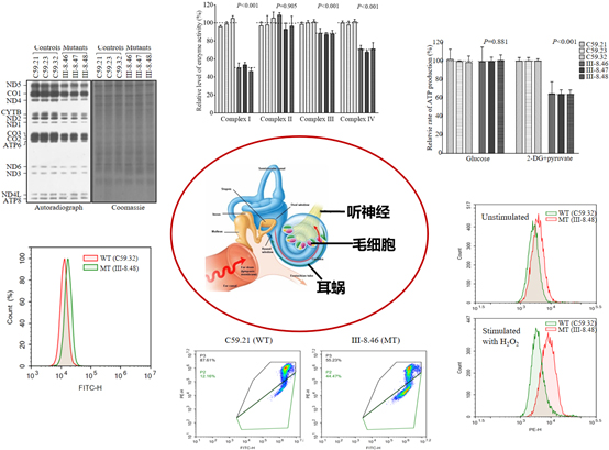 转线粒体融合细胞模型进一步研究发现该突变导致tRNAIle稳态水平和氨基酰化水平的明显下降。作为蛋白质合成中氨基酸的转运载体,tRNA结构和功能障碍导致的蛋白质合成受阻引起线粒体内蛋白稳态失衡,呼吸链复合体氧化磷酸化活性降低,氧耗速率下降,线粒体ATP合成减少,线粒体膜电位降低,活性氧水平增加及细胞凋亡水平增高。内耳的毛细胞能量代谢水平需求较高,且毛细胞对内环境离子的稳定比较敏感,突变导致的线粒体供能不足和ROS增加加剧了内耳毛细胞损伤和凋亡,影响内耳功能,最终引发耳聋。