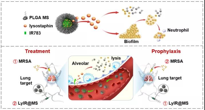 溶葡萄球菌酶(lysostaphin)是一种内生肽酶,能特异性酶切葡萄球菌细胞壁中的交联多甘氨酸桥,在体内及体外显示出对葡萄球菌包括MRSA菌株的杀菌能力,同时也可以有效的破坏生物膜,是一种非常有潜力的抗菌药物。目前溶葡球菌酶已被成功研究报道用于骨骼感染,角膜炎,皮肤感染等疾病模型,但是不同于角膜,皮肤等相对较为浅表的器官,处于深部的肺脏器,通过静脉途径给药后,溶葡球菌酶在肺内的有效浓度较低,难以达到治疗效果。针对以上问题,近期,浙江大学转化医学研究院周民研究员课题组、新加坡国立大学陈小元教授课题组和日韩欧美福利视频_黑人巨大人精品欧美三区_欧美成人另类人妖_欧美在线精品一区二区三区_欧美一区二区三区性视频_日韩精品欧美视频_性欧美极品xxxx欧美一区二区附属第二医院徐峰教授课题组联合在国际知名期刊ACS Nano上发表文章“Lung Targeting Lysostaphin Microspheres for Methicillin-Resistant Staphylococcus aureus Pneumonia Treatment and Prevention”(IF:15.881)。